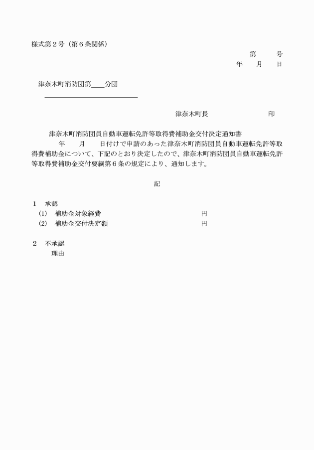 第5条 補助金の交付を受けようとする者(以下「申請者」という。)は、津奈木町消防団員自動車運転免許等取得費補助金交付申請書(様式第1号)に次に掲げる書類を添えて、町長に提出するものとする。